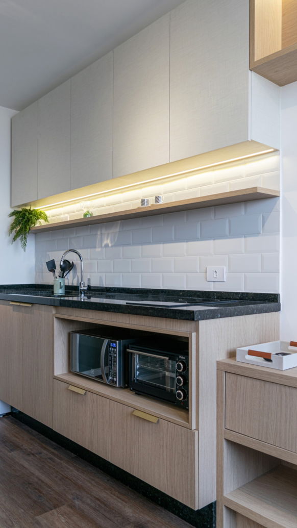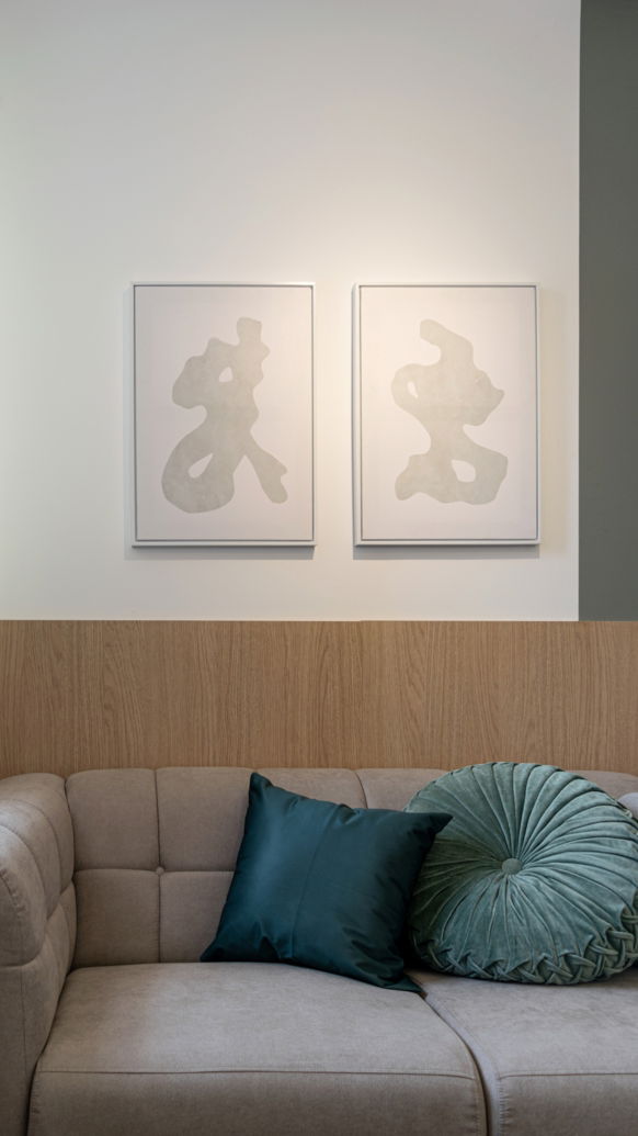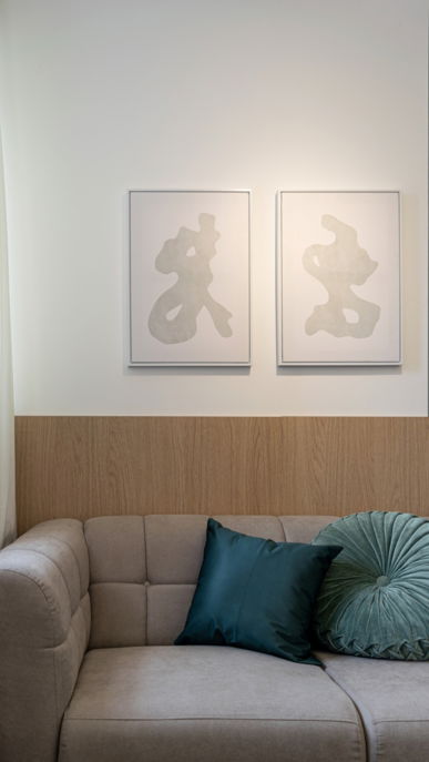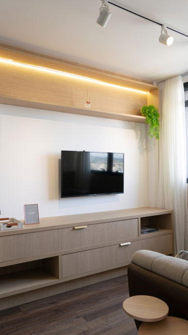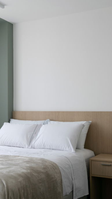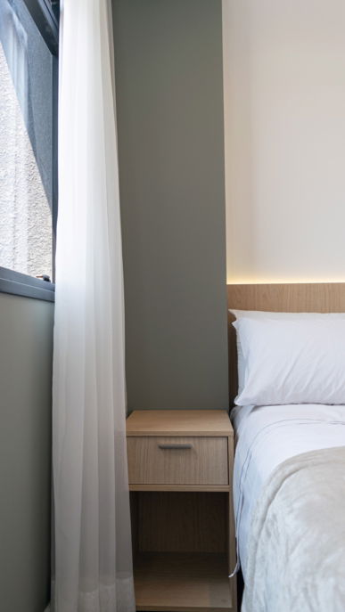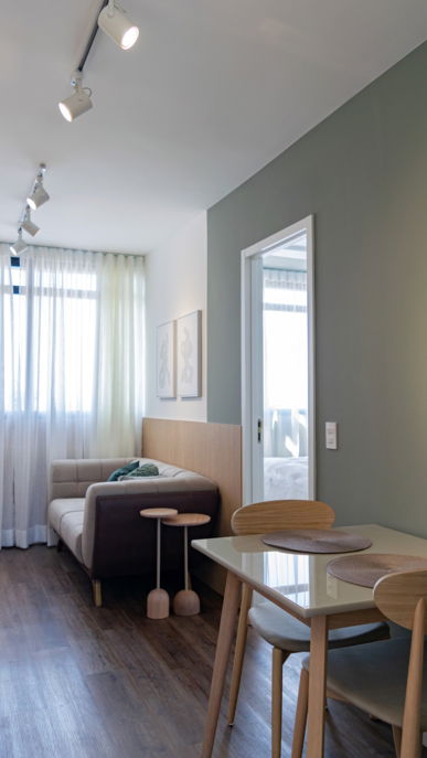 Nesse apartamento buscamos passar uma sensação de paz, tranquilidade e relaxamento! Aqui nós traduzimos essas sensações em materiais: com o tecido branco da cama, o verde da parede, o tecido de linho leve da cortina e a madeira da cabeceira.