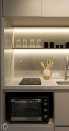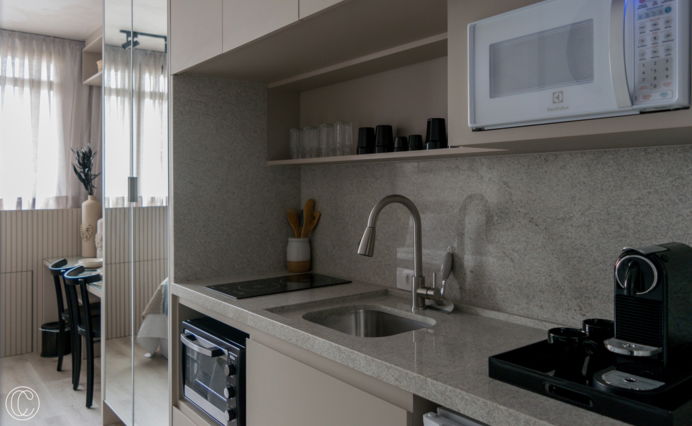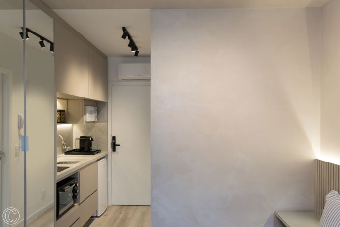 O Studio LM traz uma paleta de cores sóbria, elegante e clara. Essa escolha de poucos materiais para compor o ambiente traz uma amplitude maior ao studio que conta com apenas 16m². Outro ponto desse projeto é a área da copa, onde o granito branco Itaúnas se torna um destaque! Aqui é importante ressaltar que com a criatividade podemos criar um espaço elegante com um material simples!